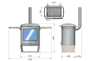 670mm (1478mm with shelves) (W), 994mm (H), 480mm (+ additional 220mm flue to rear) (D)