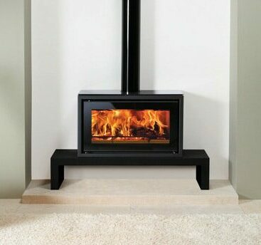 Riva Studio stove has a number of options, including a black glass top plate, matching gloss black flue pipe cover and benches in high or low versions.
